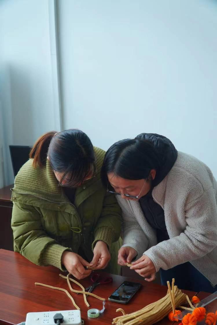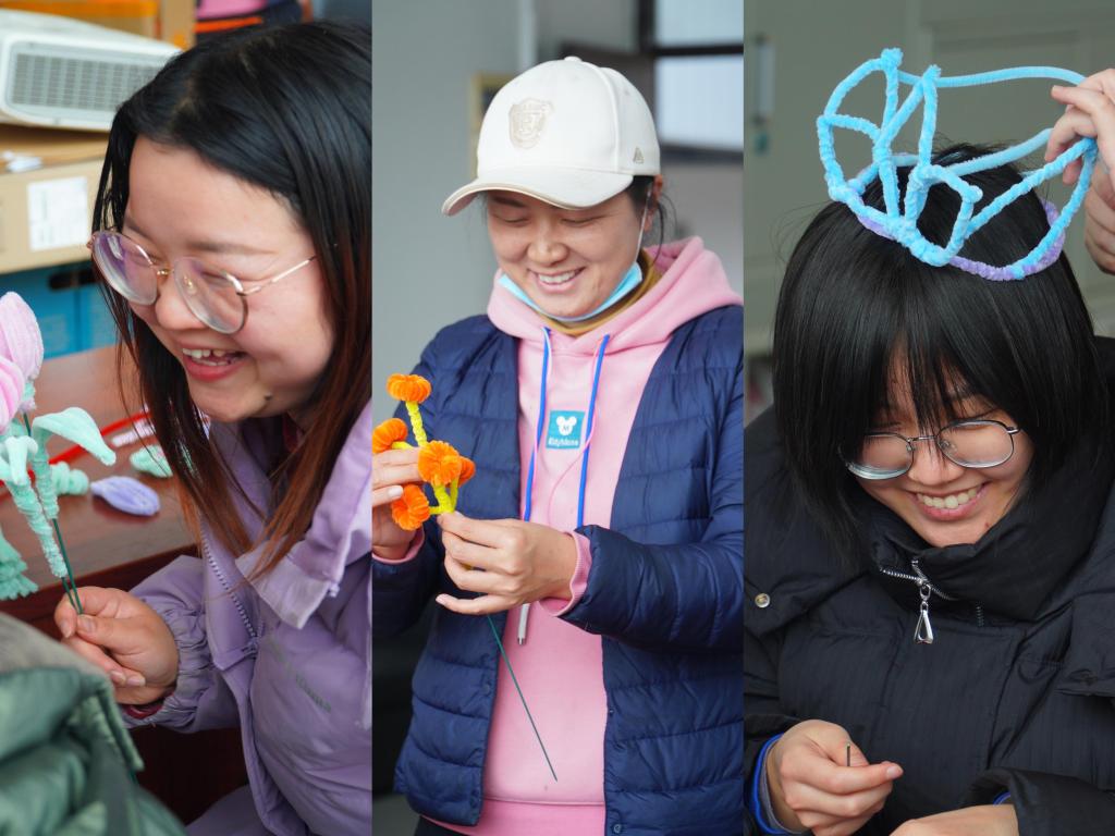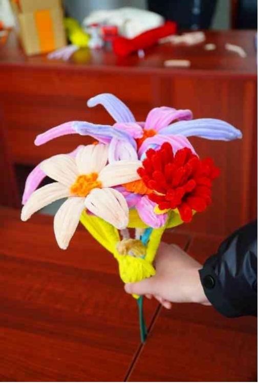 活动由每位老师亲手完成,每位女教师都被赋予了一束不同种类的鲜花和一块简单的花艺基座。她们目光灵动地选取材料,亲手编织成花朵的模样,在老师的努力下,一朵朵花朵簇拥而成的作品在老师们灵巧的双手中渐渐成形。