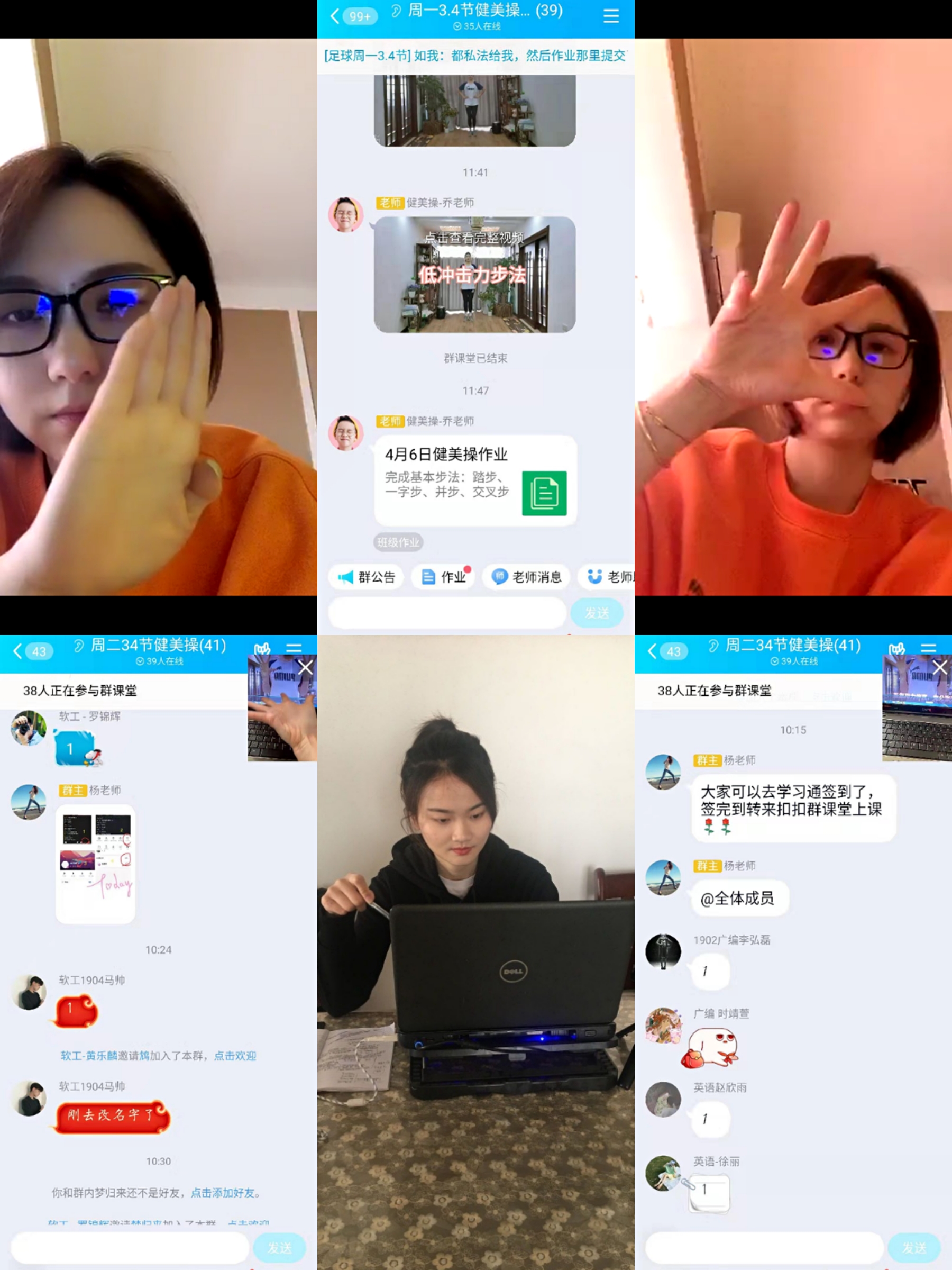看,健美操科任教师乔姝老师、杨优老师:健身操是融体操、音乐、舞蹈于一体的追求人体健康与美的运动项目,因此,健身操具有体育、舞蹈、音乐、美育等多种社会文化功能。老师们采用QQ群课堂方式直播授课,将动作分布讲解,并连线员工视频,观察员工的动作,帮助纠正不正确姿势。真正做到了与员工无障碍沟通,也增加了课堂的互动性。