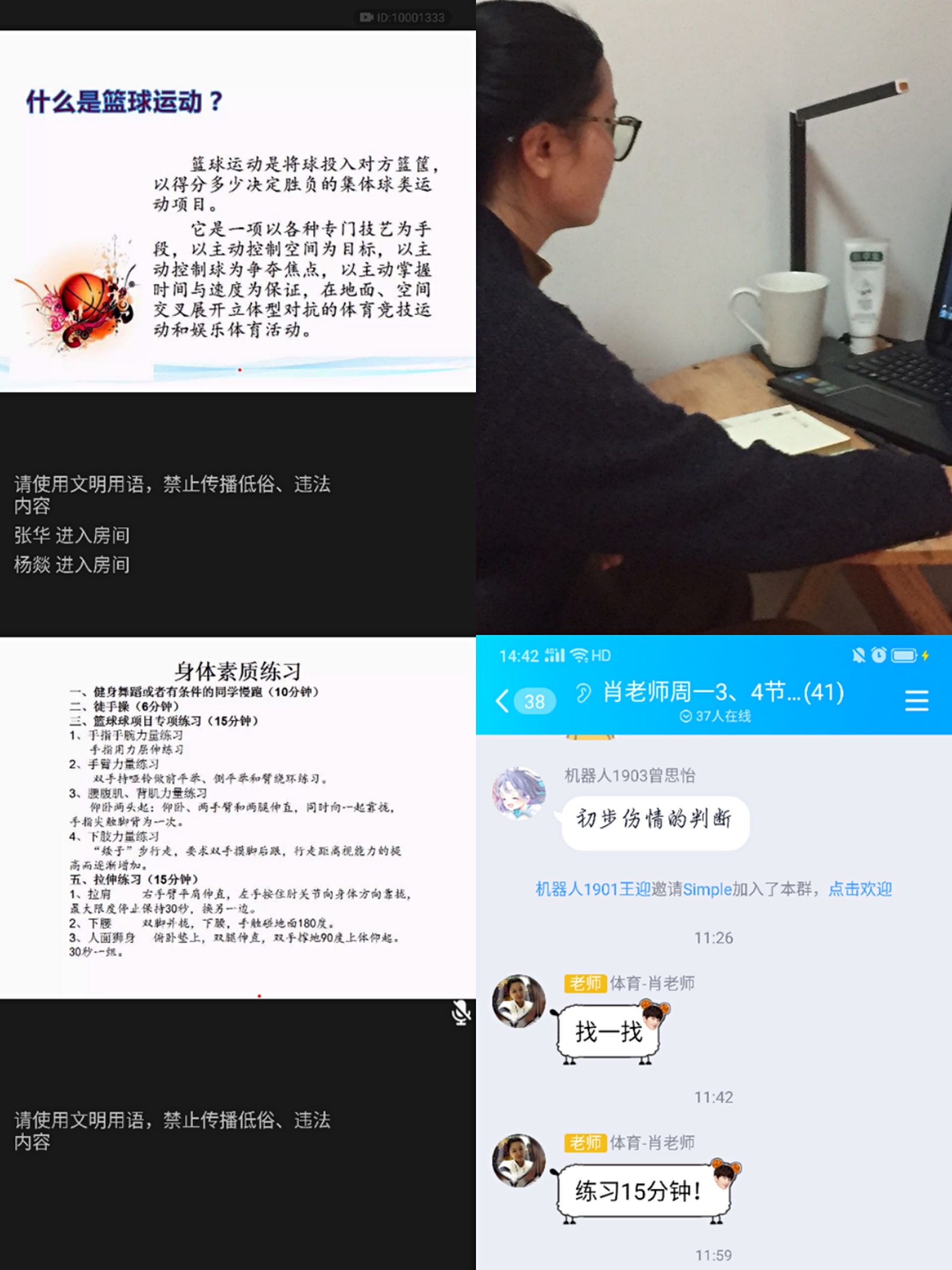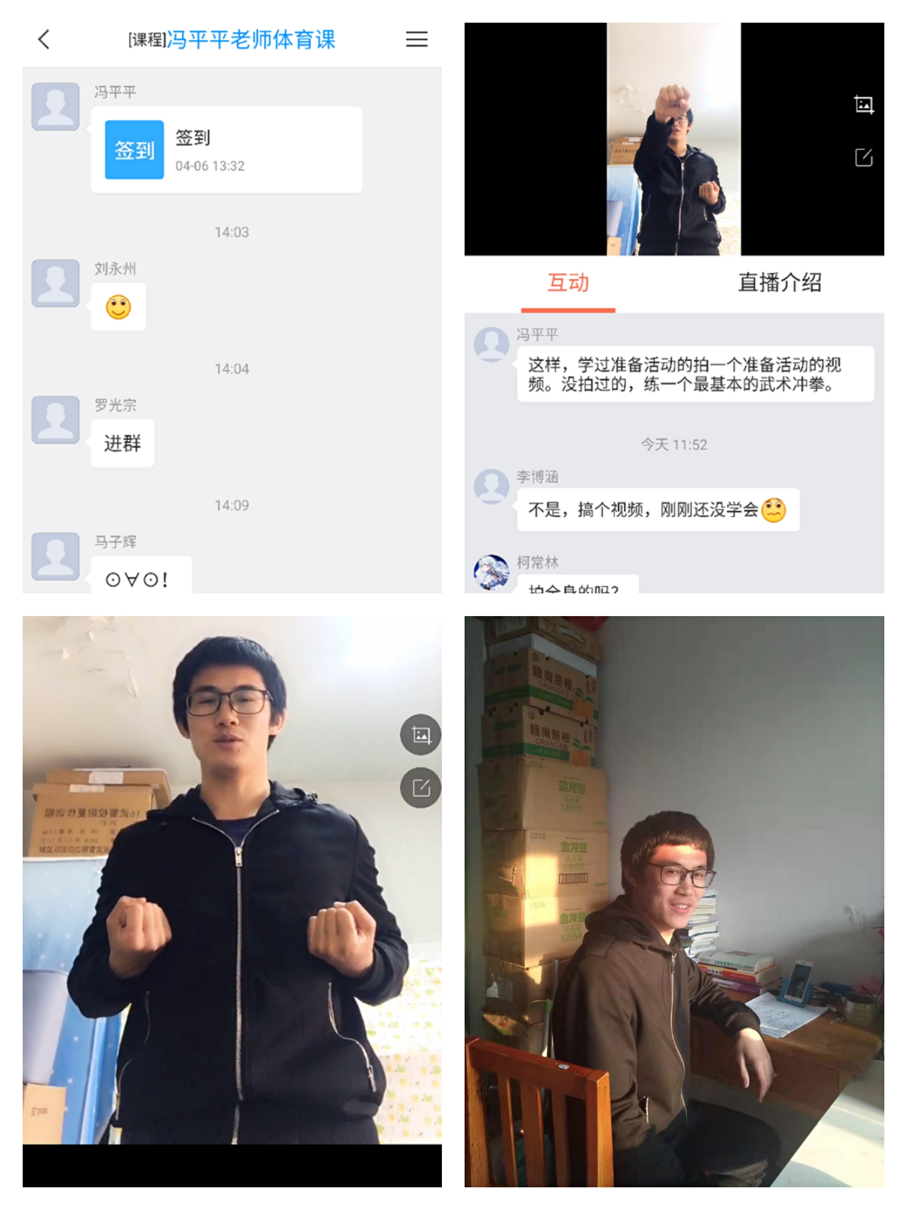 看,武术科任教师冯平平老师:利用超星智慧课堂直播授课和QQ群课堂授课进行线上教学,授课过程中首先讲述武术的基本知识,随后示范了武术的几种拳法,并分步讲解动作及其要领,课程结束留下课后作业要求员工去完成,并拍视频上传,以达到复习巩固,锻炼身体的效果。