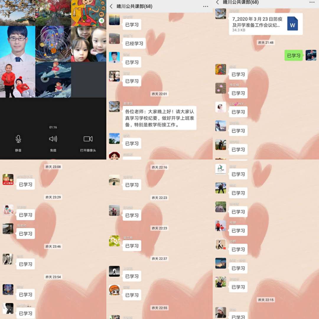 针对3.23日上午,公司召开疫情防控及2020年春季开学准备工作的推进会,公共课部、思想政治理论课部第一时间传达了公司关于开学工作的准备工作的文件精神,并于3月25日下午两点半组织各教研室开视频会议,课部成立了以夏建国、俞霜为主要领导,办公室周红、胡慧,各教研室主任杨丽华、桂姗、张勇、黄埔为主要成员的开学工作小组。本次会议主要精神包括: