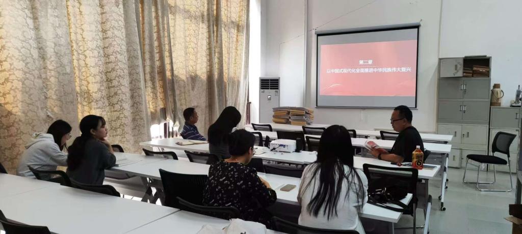 首先,张老师介绍了习近平新时代中国特色社会主义思想课程的备课授课经验,从备课思路、教学理念、创新思考等角度,为教研室新进教师做了讲解与指导。其次,张老师进行了以《以中国式现代化全面推进中华民族伟大复兴》为主题的示范课教学展示。